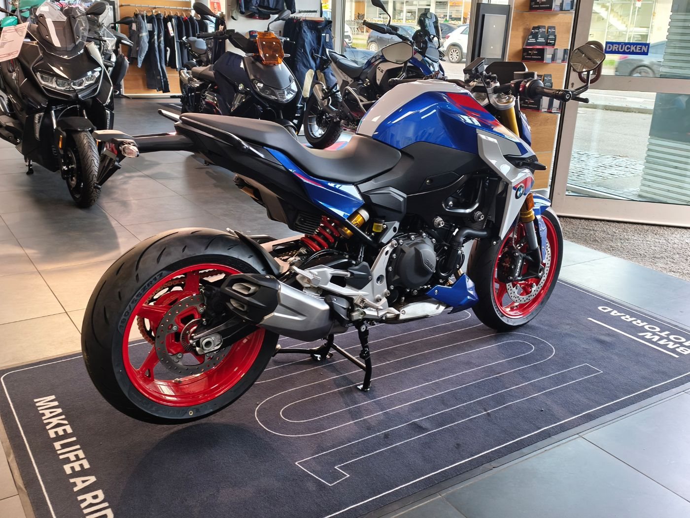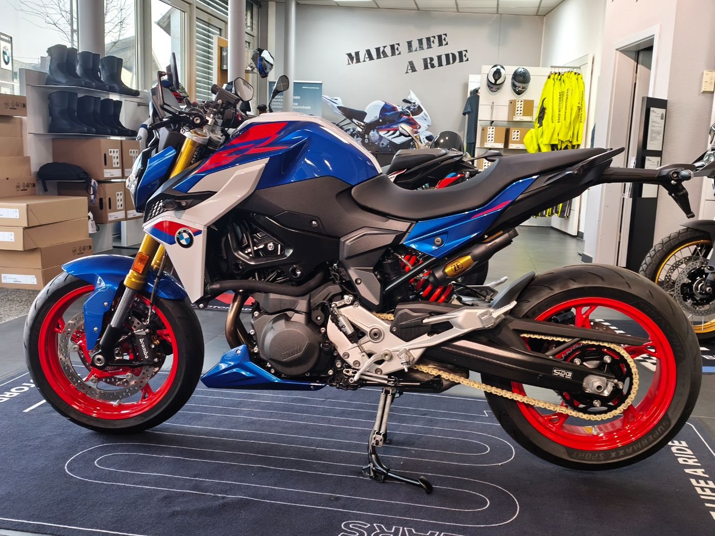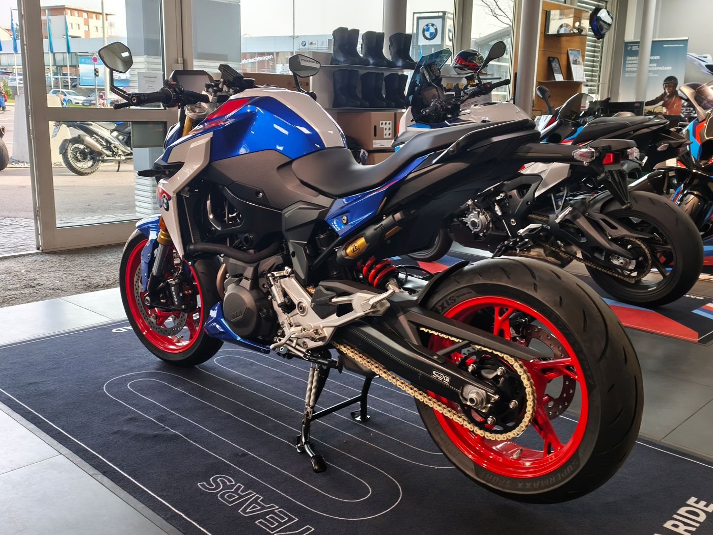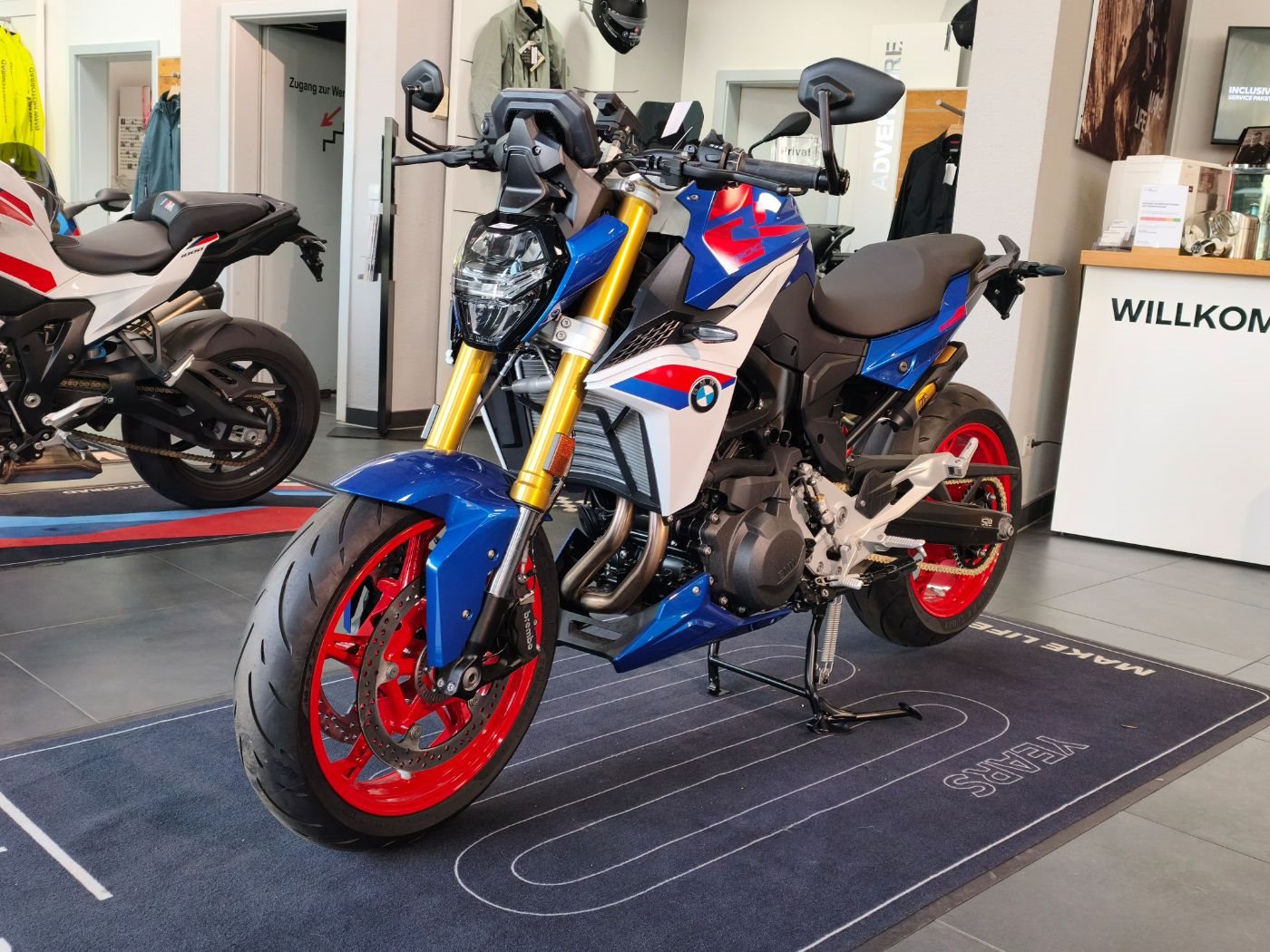 • Lackierung in Racingblue metallic mit roten und weißen Akzenten